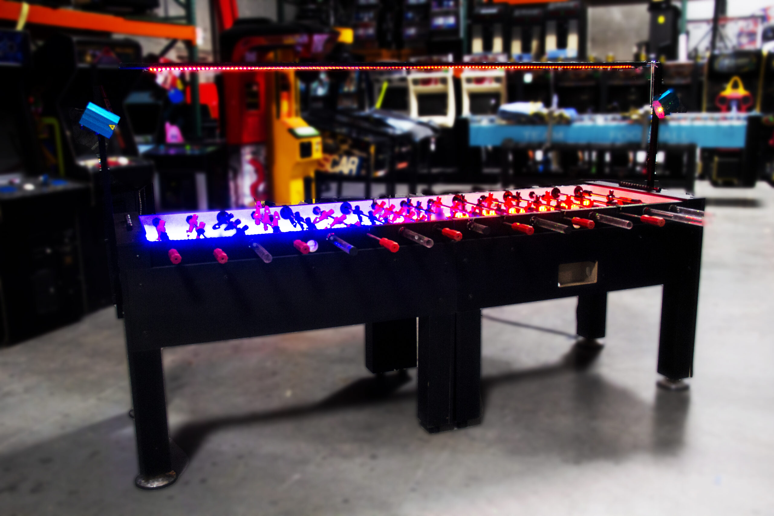 Up to 8 players, color changing LEDs, Battery Operated Team Foosball Table.