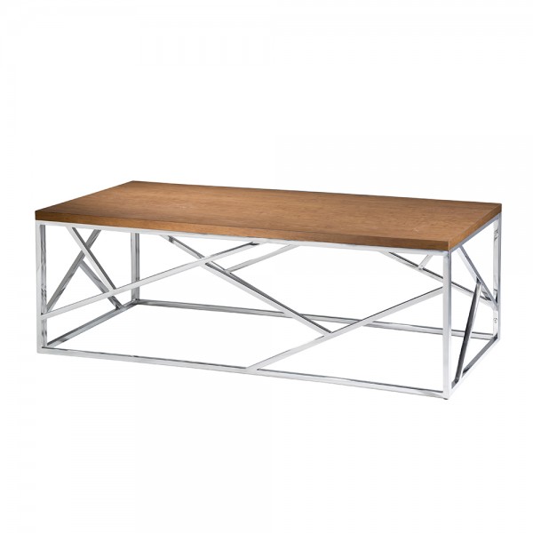 Contemporary, geometric chrome base cocktail table with glass top adds an eclectic touch to any design. Also available with a marble or wood top.