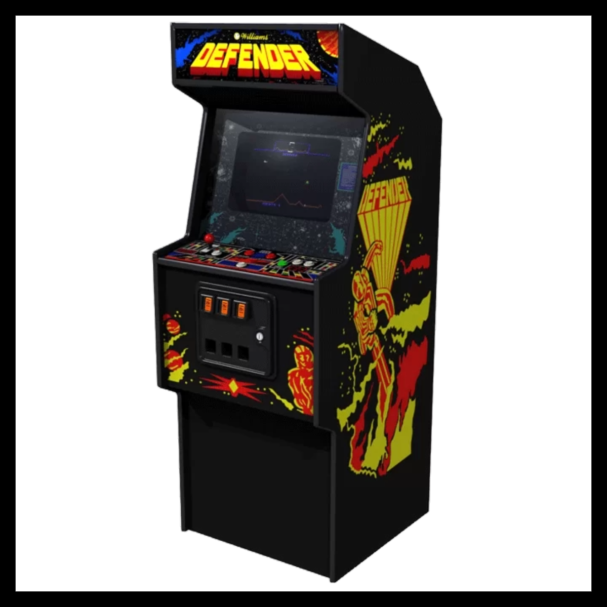 Defender is a two-dimensional side-scrolling shooting game set on the surface of an unnamed planet. The player controls a space ship as it navigates the terrain, flying either to the left or right. A joystick controls the ship’s elevation, and five buttons control its horizontal direction and weapons. The object is to destroy alien invaders, while protecting astronauts on the landscape from abduction. Humans that are abducted return as mutants that attack the ship. Defeating the aliens allows the player to progress to the next level. Failing to protect the astronauts, however, causes the planet to explode and the level to become populated with mutants. Surviving the waves of mutants results in the restoration of the planet. Players are allotted three ships to progress through the game and are able to earn more by reaching certain scoring benchmarks. A ship is lost if it is hit by an enemy, or hit by an enemy projectile, or if a hyperspace jump goes wrong (as they randomly do). After exhausting all ships, the game ends.