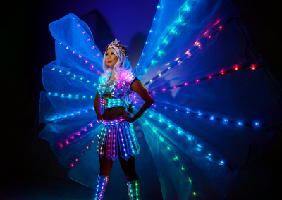 DJ Miss Joy is an established professional when it comes to high end corporate events in Las Vegas and around the world, and her newest specialty outfit is the perfect visual compliment to her amazing talents. This custom designed outfit boasts an 8’ wing span with full color LED animation, and bookings include a custom DJ booth that provides maximum visibility of the costume from the audience. The LED technology we use has dozens of animated patterns and color themes to create a stunning visual experience to match the color palette of your event. Perfect for EDM themed parties, costume and cosplay events, and any event where clients are looking for something unique and out of the ordinary.