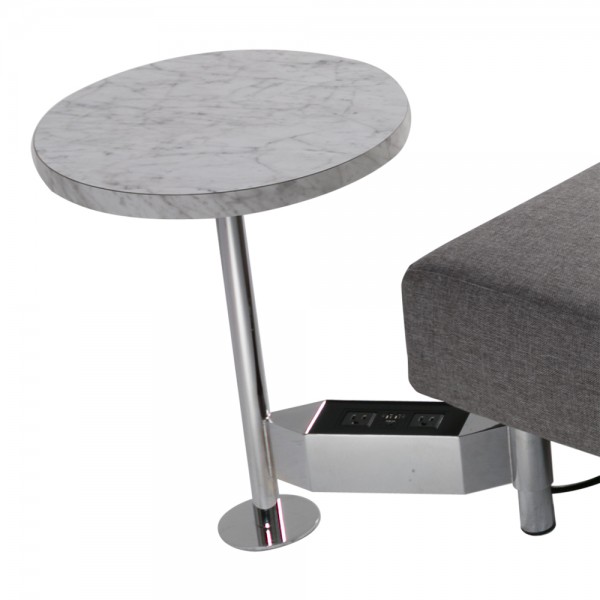 16″ round glass-top table with chrome pedestal contains one black power hub with two outlets and two USB ports. Can be attached to all Endless Collection seat bases and configurations. Does not stand alone.