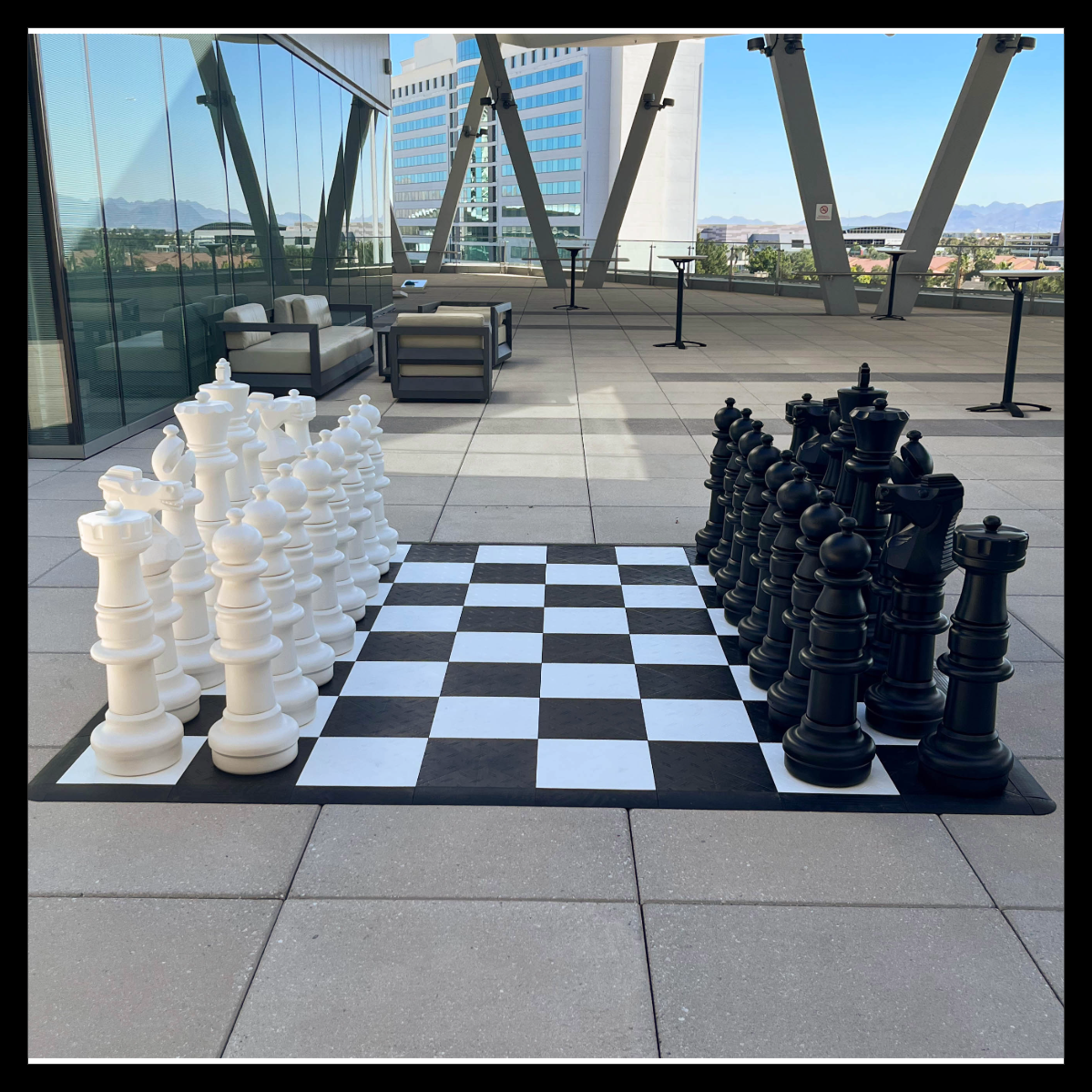 ONE OF THE MOST POPULAR SETS LARGER THAN LIFE FUN: The Premium 49-Inch Giant Chess Set! It includes 16 black and 16 white pieces ranging in height from a 49-inch king to a 40-inch-tall pawn. The set can be used indoors or outdoors and is made with high-quality, long-lasting materials.
