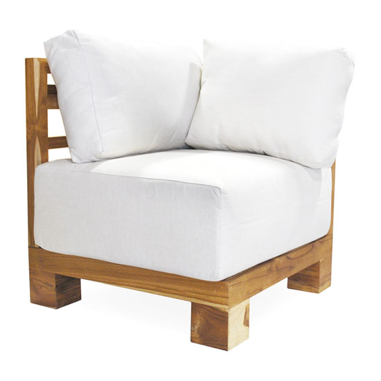 Flexible and modular solid teak wood corner chair features deep seat and thick, comfortable cushions with 100% acrylic Sunbrella fabric upholstery. Perfect for indoor or outdoor use.