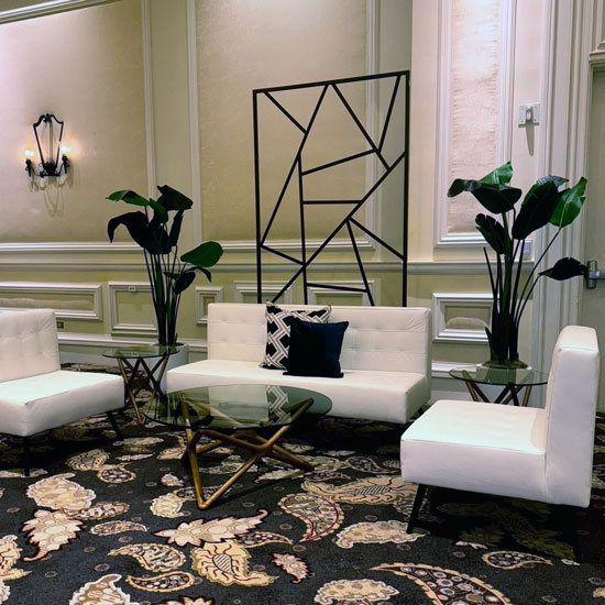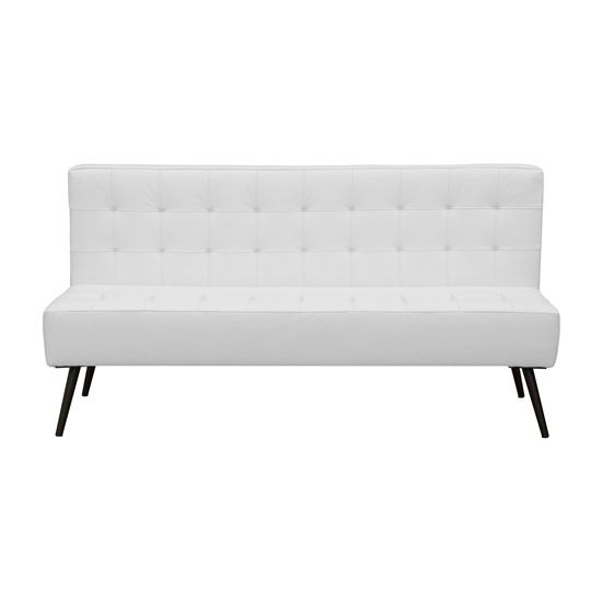 Modern and sophisticated sofa in crisp bright white upholstery features tufted seat and back, angled black legs, and versatile compact design.