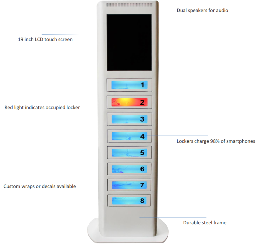 The 19 inch touchscreen can be custom branded with images or videos of your company or sponsor. This along with other customization options such as decals or full wraps allow the phone charging kiosks with lockers to blend into any setting and build buzz for brands.