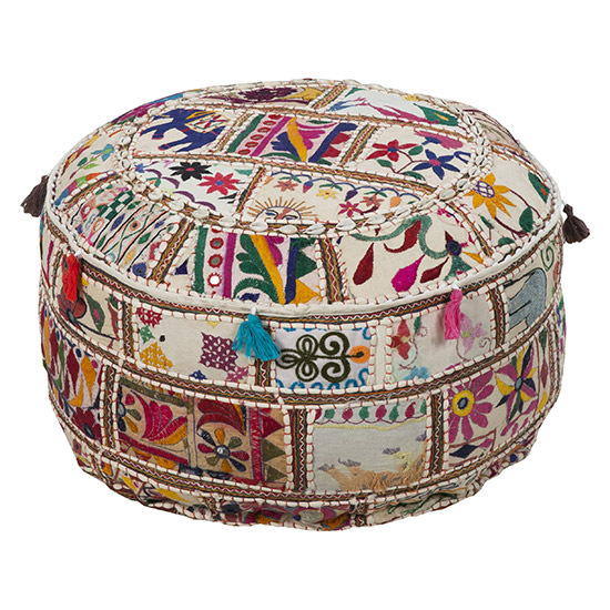 Natural and unique round burlap pouf features intricate hand-sewn details