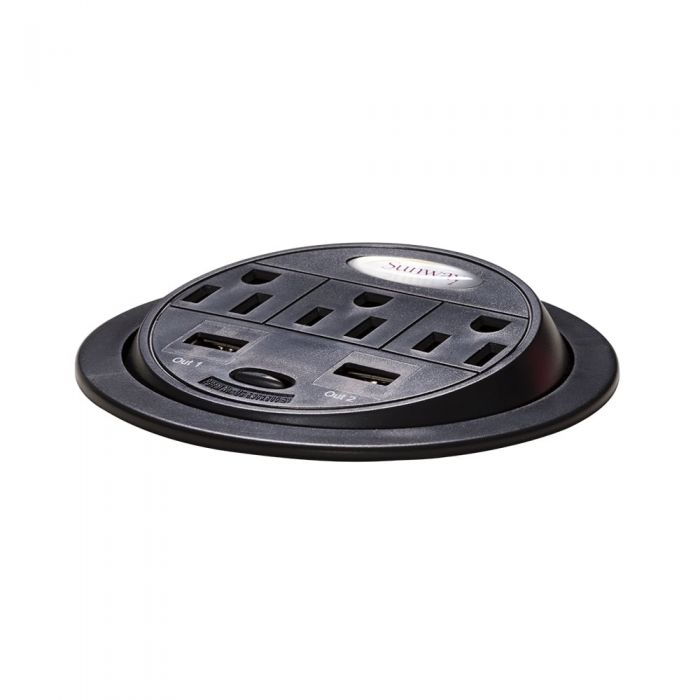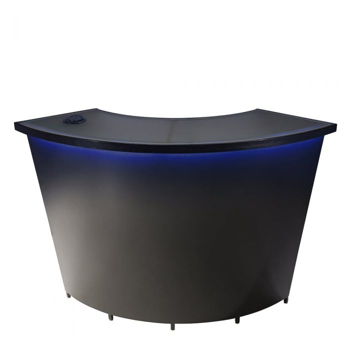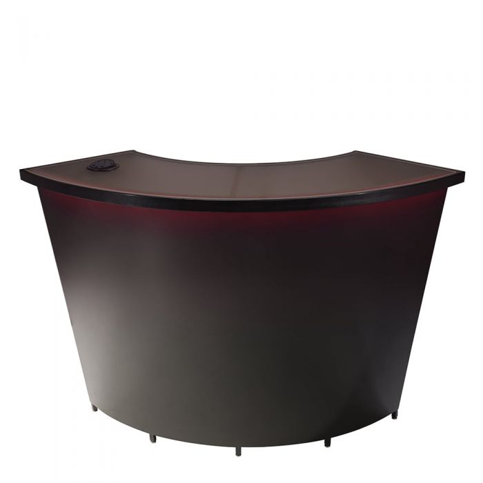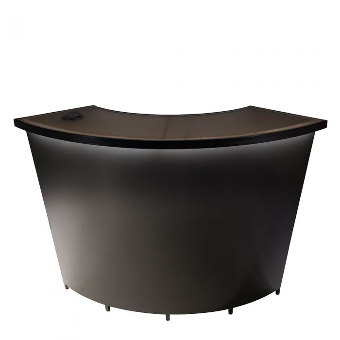 Metallic pewter gray curved counter with taupe colored glass top features an electrical charging unit featuring 3 AC and 2 USB plugs. Counter also includes a locking cabinet for storage and 2 shelves. Available with LED lighting