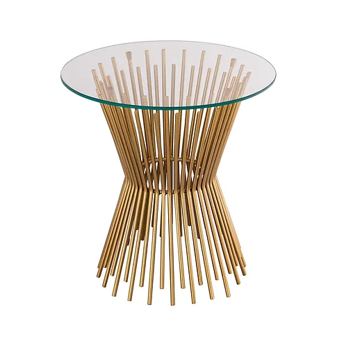 Milan end table has a clear glass top and an hourglass base of iron-spokes with a satin gold finish.
