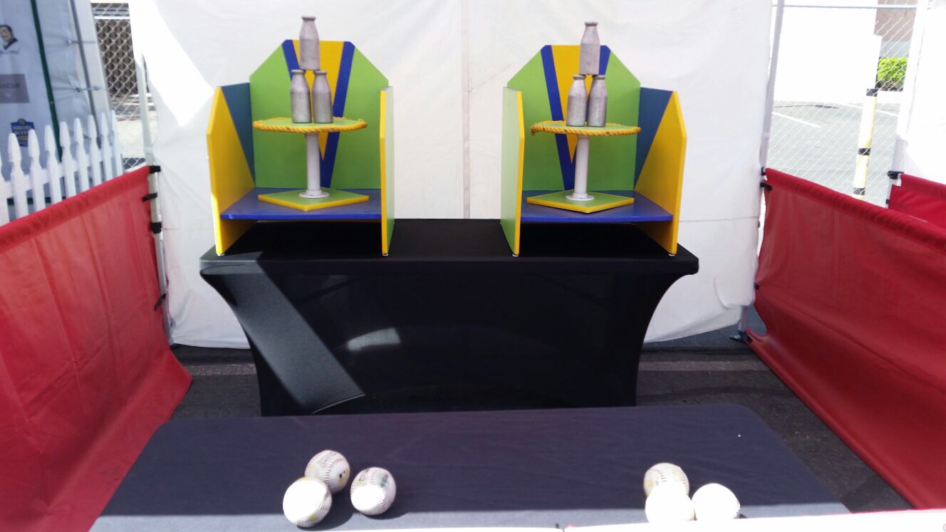 Test your skills with our Milk Bottle Knockdown! Two or three aluminum milk bottles are set up on a “one ball table”. Player must knock all three bottles over with one good softball throw. This midway classic is sure to keep your guests happy as they challenge each other to pitching duels. There are two player stations for each game.