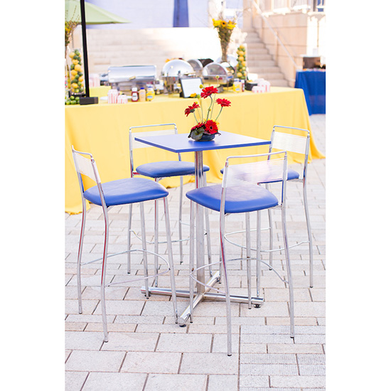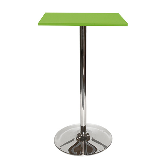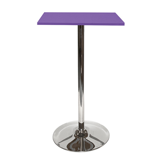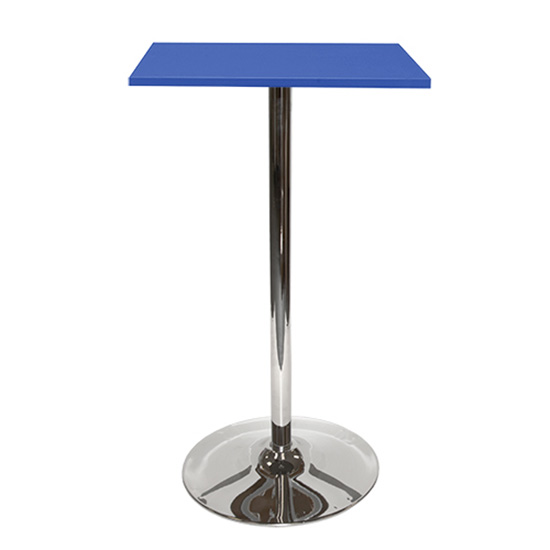 Bar table with chrome steel tubular base and colored laminate square top. Available in Blue, Green, Purple, and Red. Bases Available in Black or Chrome. Also available with Tulip Base.