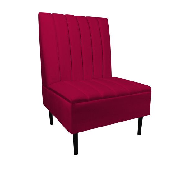 Striking armless chair offers a bold, modern design with a high back, plush padding, and elegant channel tufting. Features sturdy, dark-finished legs. Modular design of this collection enables versatile configurations, allowing you to mix and match pieces to create a truly personalized seating experience. Available in eye-catching Cherry, Ivory, or Midnight armless chairs and Ivory or Midnight left/right-facing corner chairs.