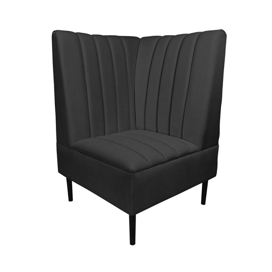 Striking right-facing corner chair offers a bold, modern design with a high back, plush padding, and elegant channel tufting. Features sturdy, dark-finished legs. Modular design of this collection enables versatile configurations, allowing you to mix and match pieces to create a truly personalized seating experience. Available in eye-catching Ivory, or Midnight armless chairs and Ivory or Midnight left/right-facing corner chairs. Verve Right Corner – Midnight